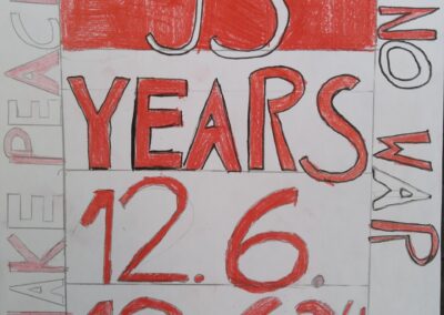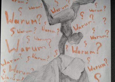 Ein Bild, das Fragen aufwirft… “Why war…warum Krieg?” in Anlehnung an den Streetart-Künstler Banksy. Anna, Klasse 8 (WBK), Blei- und Buntstift
