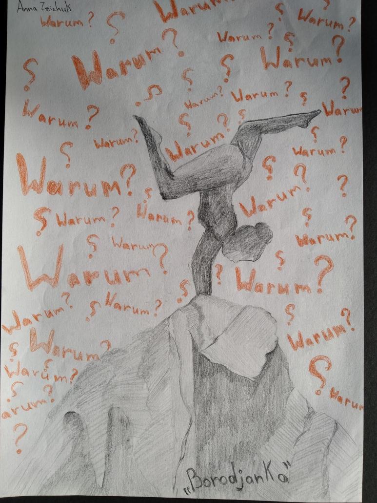 „Why war…warum Krieg?“ in Anlehnung an den Streetart-Künstler Banksy. Anna, Klasse 8 (WBK), Blei- und Buntstift